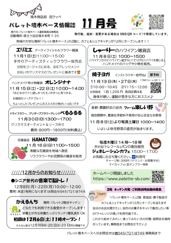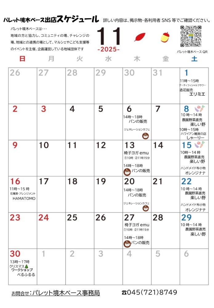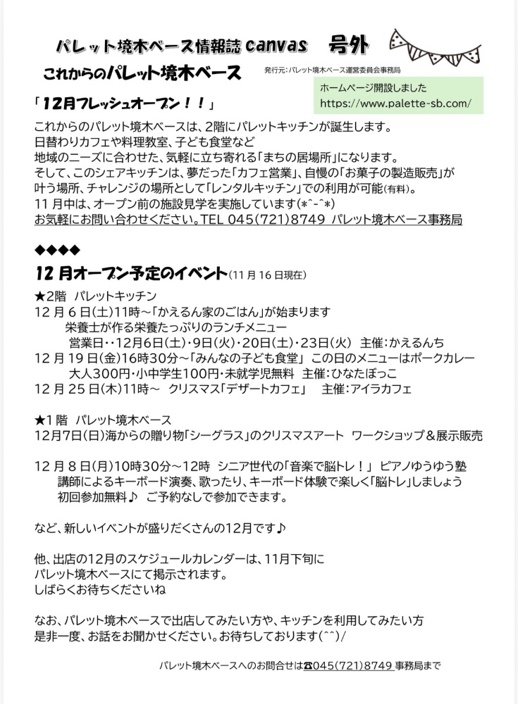 他、出店の12月のスケジュールカレンダーは、11月下旬にパレット境木ベースにて掲示されます。