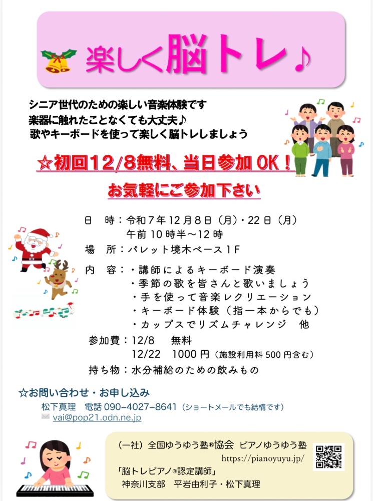ピアノゆうゆう塾講師によるキーボード演奏、歌ったり、キーボード体験で楽しく「脳トレ」しましょう初回参加無料♪